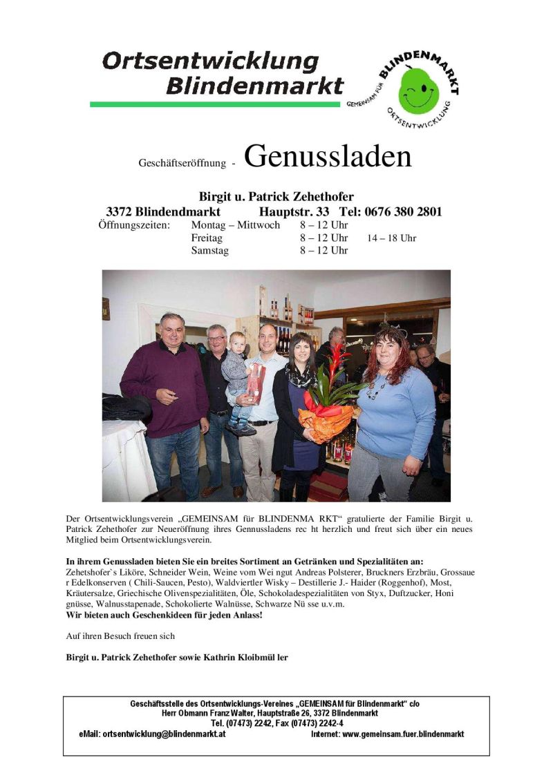 Der Ortsentwicklungsverein „GEMEINSAM für BLINDENMARKT“ gratulierte der Familie Birgit und Patrick Zehethofer zur Neueröffnung ihres Gennussladens recht herzlich